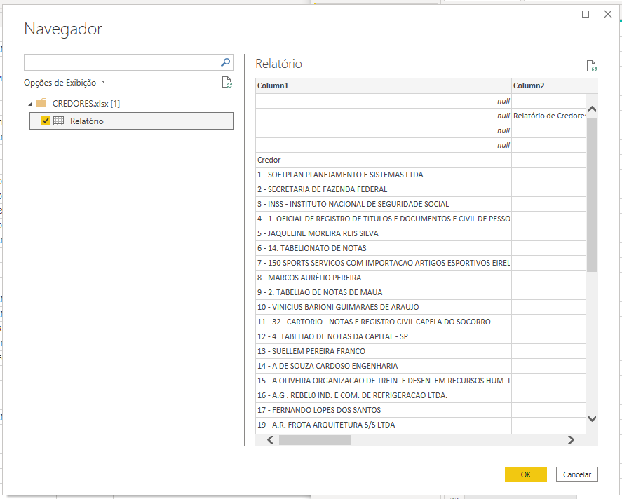 Não precisamos disto no POWER BI, precisamos somente da linha 5 que nos dá o cabeçalho e dos dados e da linha 6 em diante que nos dão os registros de cada credor.