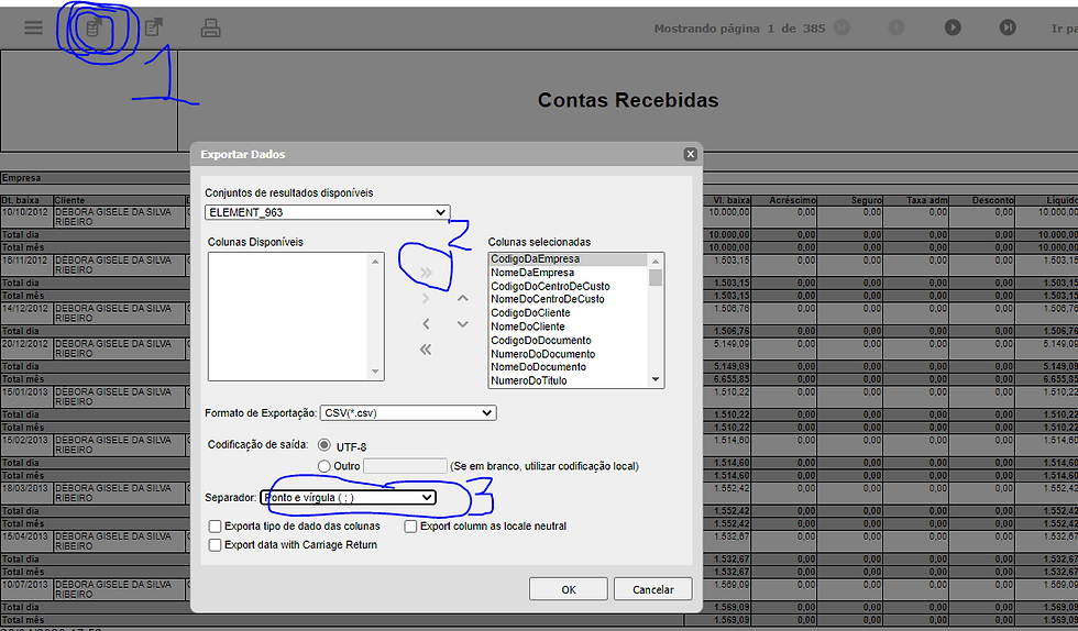 Selecione o ícone indicado pelo número 1. Ele permite a exportação de dados.